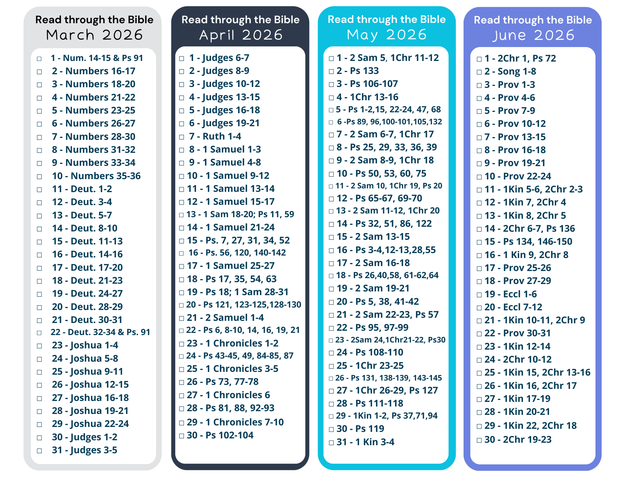 Following the popular Bible Recap model, beginning January 1st we'll examine the Bible with an eye on better understanding and appreciating God's redemptive work in the Old and New Testaments. Each day of the year has assigned Scripture passages for reading. Using the monthly chart below, simply find today's date and read the designated passages for the day.