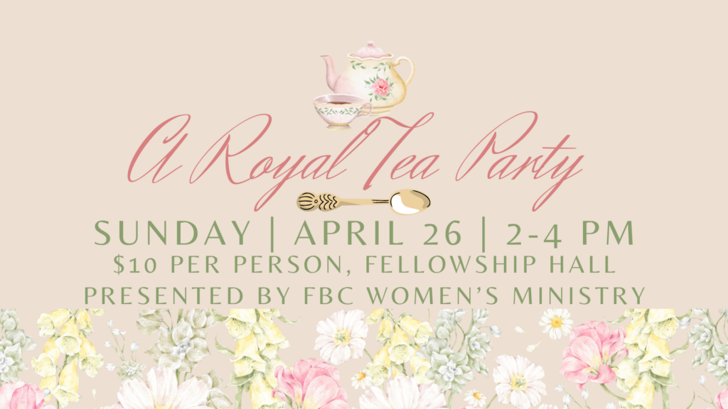 FBC Women’s Ministry presents “A Royal Tea Party” on Sunday, April 26, 2:00-4:00 pm at the FBC Downtown Fellowship Hall. (Note: This event is SOLD OUT.)
